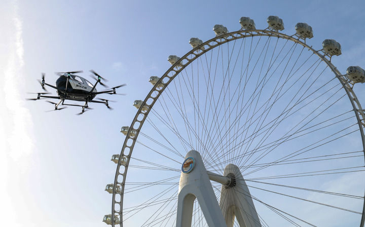 在深圳市寶安區(qū)城市空中交通運(yùn)營(yíng)示范中心,億航eVTOL航空器進(jìn)行展示飛行(2025年4月16日攝)。新華社記者 毛思倩 攝