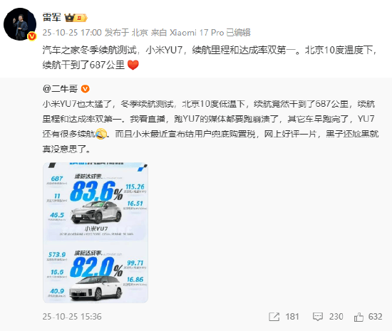 小米集團董事長雷軍在轉(zhuǎn)發(fā)測試報告時特別強調(diào):"小米YU7在10℃環(huán)境下實現(xiàn)續(xù)航里程與達成率雙料第一,充分驗證了電池管理系統(tǒng)的技術(shù)優(yōu)勢。"他同時透露,企業(yè)正在籌備更嚴苛環(huán)境下的續(xù)航驗證測試。汽車行業(yè)分析師指出,當前新能源汽車續(xù)航測試標準尚未完全統(tǒng)一,不同機構(gòu)采用的測試工況、環(huán)境參數(shù)存在差異,消費者在參考數(shù)據(jù)時應結(jié)合具體測試條件進行綜合判斷。