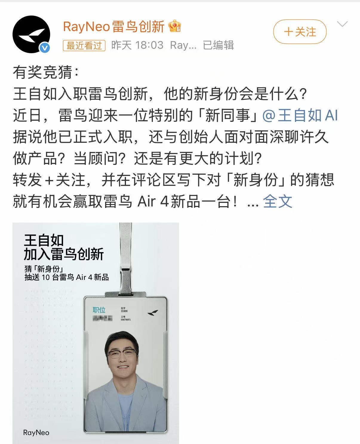 近日,AR領域知名品牌雷鳥創新通過官方渠道對外宣布,知名數碼領域人物王自如已正式加入公司團隊,并展示了其工作證件,但未具體說明其擔任的職務。