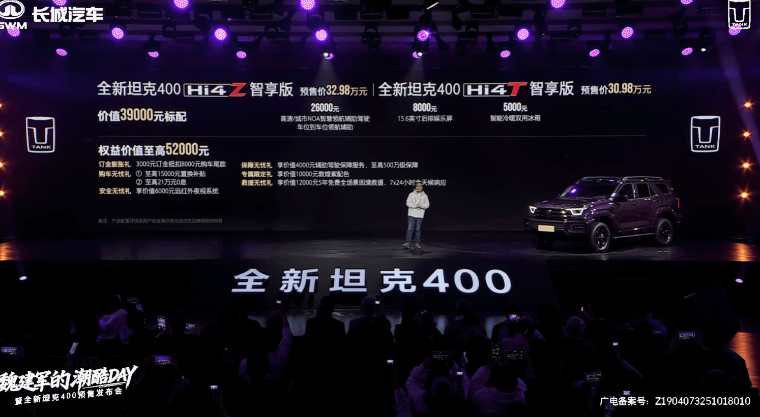 備受關注的新款坦克400(官方命名為“全新坦克400”)正式啟動預售,此次預售共推出Hi4-Z智享版和Hi4-T智享版兩款配置車型,預售價分別為32.98萬元和30.98萬元。作為中期改款車型,新車在外觀細節和科技配置上進行了顯著升級,為消費者帶來更多選擇。
