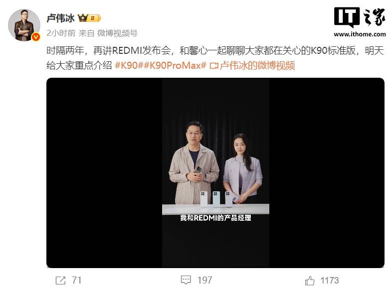 小米集團(tuán)合伙人、總裁盧偉冰通過(guò)社交平臺(tái)發(fā)布預(yù)熱視頻,正式宣布將于明日19:00舉辦REDMI K90系列新品發(fā)布會(huì)。這是其時(shí)隔兩年后再次親自登臺(tái)主講REDMI產(chǎn)品發(fā)布會(huì),引發(fā)科技圈高度關(guān)注。
