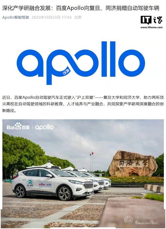 近日,國內自動駕駛領域迎來重要進展——百度Apollo自動駕駛車輛相繼進入復旦大學、同濟大學等頂尖高校,通過車輛捐贈、技術開放等形式,深度參與高校科研創新與人才培養體系建設。