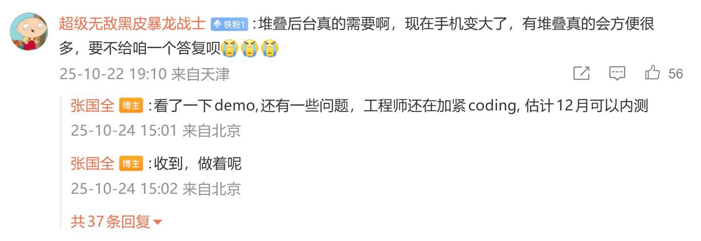 事件起因于10月22日,某用戶在張國全轉(zhuǎn)發(fā)的技術(shù)訪談微博下留言,指出當(dāng)前大屏手機(jī)缺乏高效的后臺管理方案。該用戶特別提到,若能實(shí)現(xiàn)按應(yīng)用啟動時間排序的堆疊式后臺界面,將顯著提升多任務(wù)處理效率。這種設(shè)計(jì)允許用戶通過橫向滑動查看后臺應(yīng)用,每個程序卡片會以動態(tài)效果依次展開,既保證信息完整性又提升操作直觀性。
