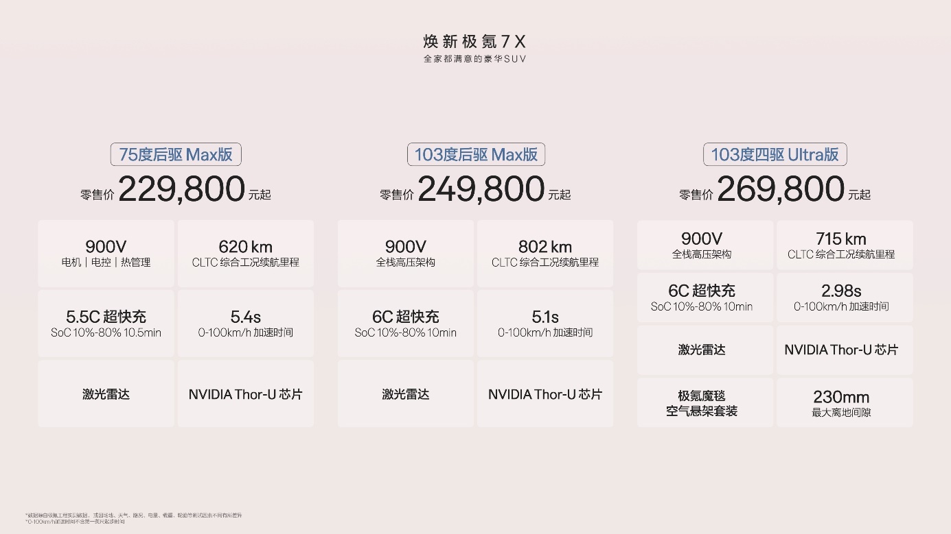 “全家都滿意的豪華SUV”——煥新極氪7X正式登陸市場,推出三款配置車型,涵蓋75度后驅Max版、103度后驅Max版及103度四驅Ultra版,官方指導價分別為22.98萬元、24.98萬元和26.98萬元。在超級置換權益加持下,限時優(yōu)惠價調(diào)整為21.98萬元、23.98萬元和25.98萬元,為家庭用戶提供更具吸引力的選擇。