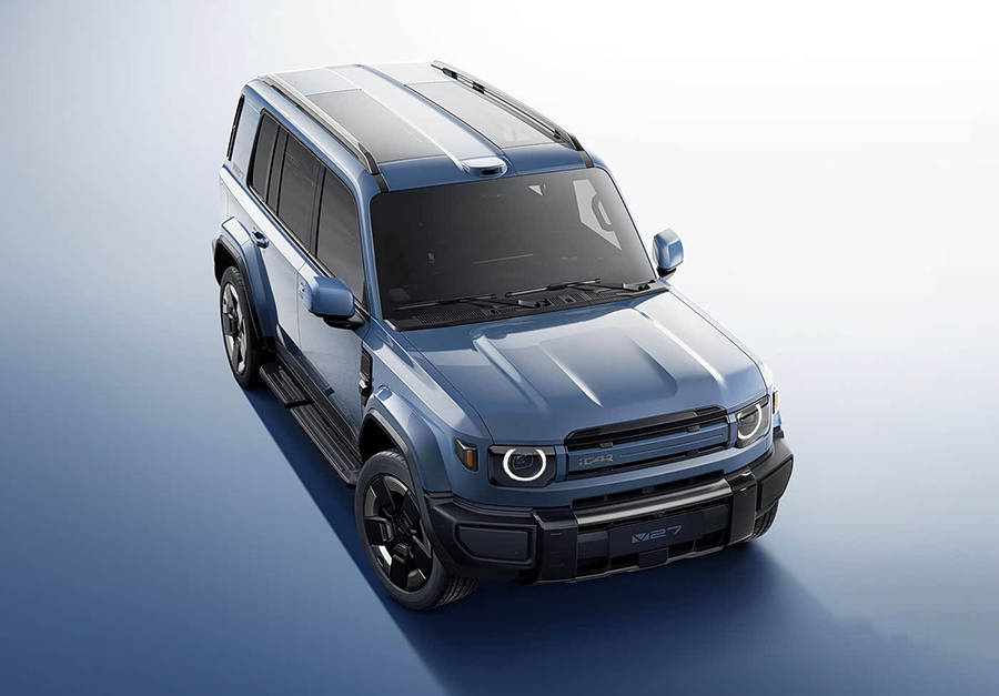 在設計語言上,iCAR V27大膽創新,既保留了硬派越野車的經典元素,又融入了前衛時尚的設計理念。其前臉部分,窄條幅式的前格柵與方形燈腔、環形燈帶相得益彰,營造出強烈的視覺沖擊力。而前包圍處寬大的銀色護板,則進一步彰顯了車輛的硬派屬性,讓人一眼便能感受到其不凡的越野性能。