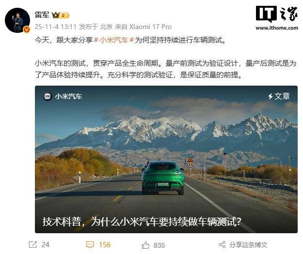雷軍近日就小米汽車測試體系作出詳細說明,特別針對“三高”(高溫、高寒、高原)測試展開介紹。他指出,汽車測試是一個貫穿車輛全生命周期的動態優化過程,涵蓋設計、開發、生產到使用的完整鏈條,主要分為量產前驗證測試與量產后泛化測試兩大階段。