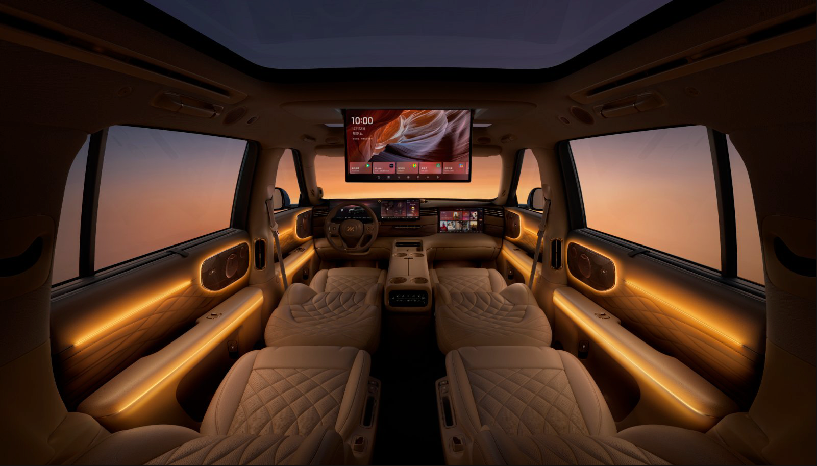 內(nèi)飾空間以頭等艙為靈感,大量皮革材質(zhì)與高級(jí)座椅營(yíng)造豪華氛圍。非對(duì)稱布局中,27.1英寸5K雙聯(lián)屏負(fù)責(zé)車輛信息與多媒體顯示,副駕駛嵌入15.6英寸3K娛樂屏,提供豐富功能。二排配備兩張零重力獨(dú)立座椅,搭載21.5英寸4K娛樂吸頂屏,Nappa真皮材質(zhì)與4D機(jī)械按摩功能凸顯配置誠(chéng)意。B&O音響系統(tǒng)總功率達(dá)3472W,25個(gè)揚(yáng)聲器帶來沉浸式視聽體驗(yàn)。