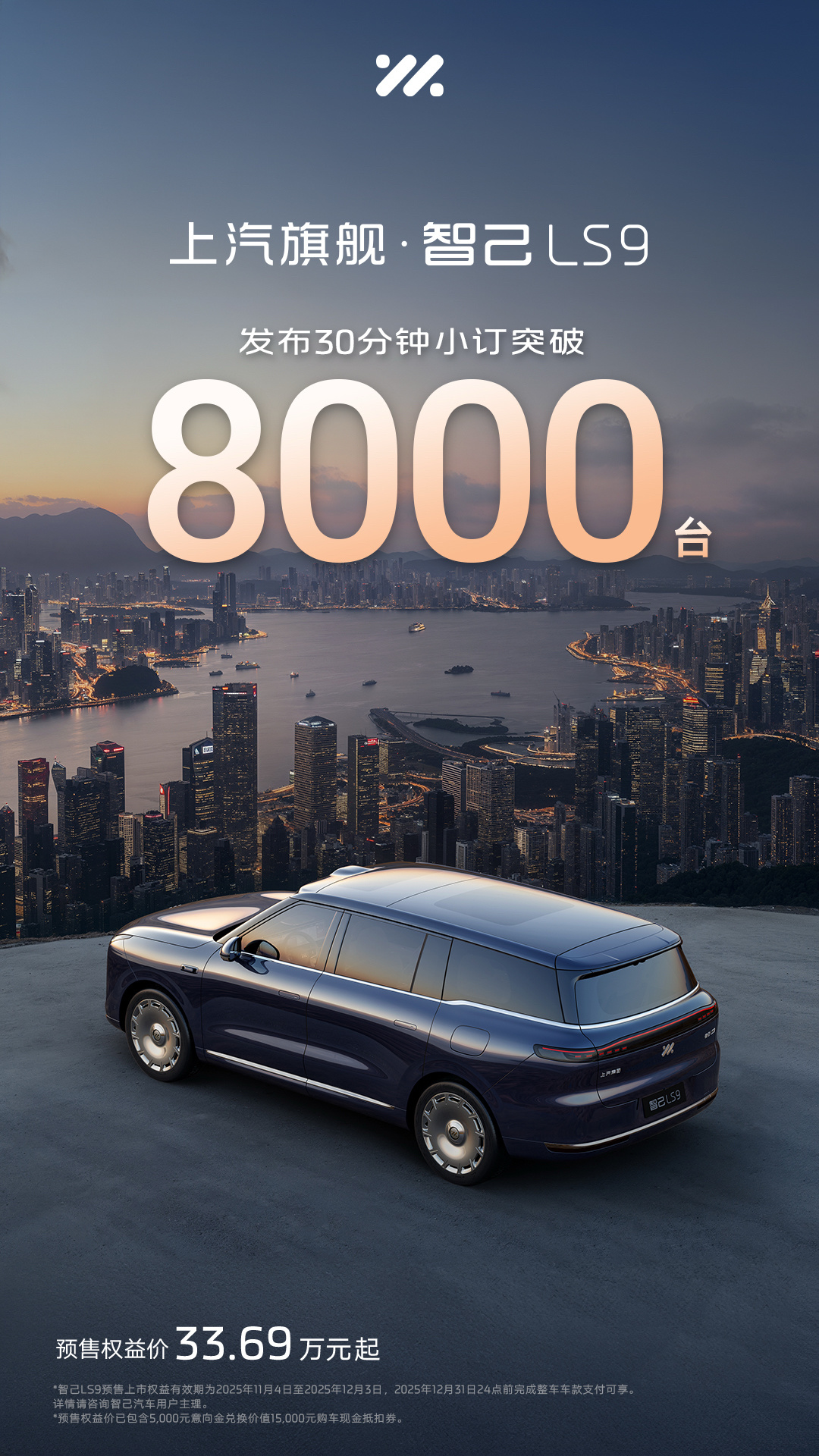 上汽集團旗下高端品牌智己汽車近日正式啟動旗艦大六座SUV——智己LS9的預售,新車在開啟預訂后的半小時內,小訂訂單量便突破8000臺。這一市場表現不僅印證了消費者對智己品牌的認可,更反映出大六座SUV品類仍存在旺盛的市場需求。