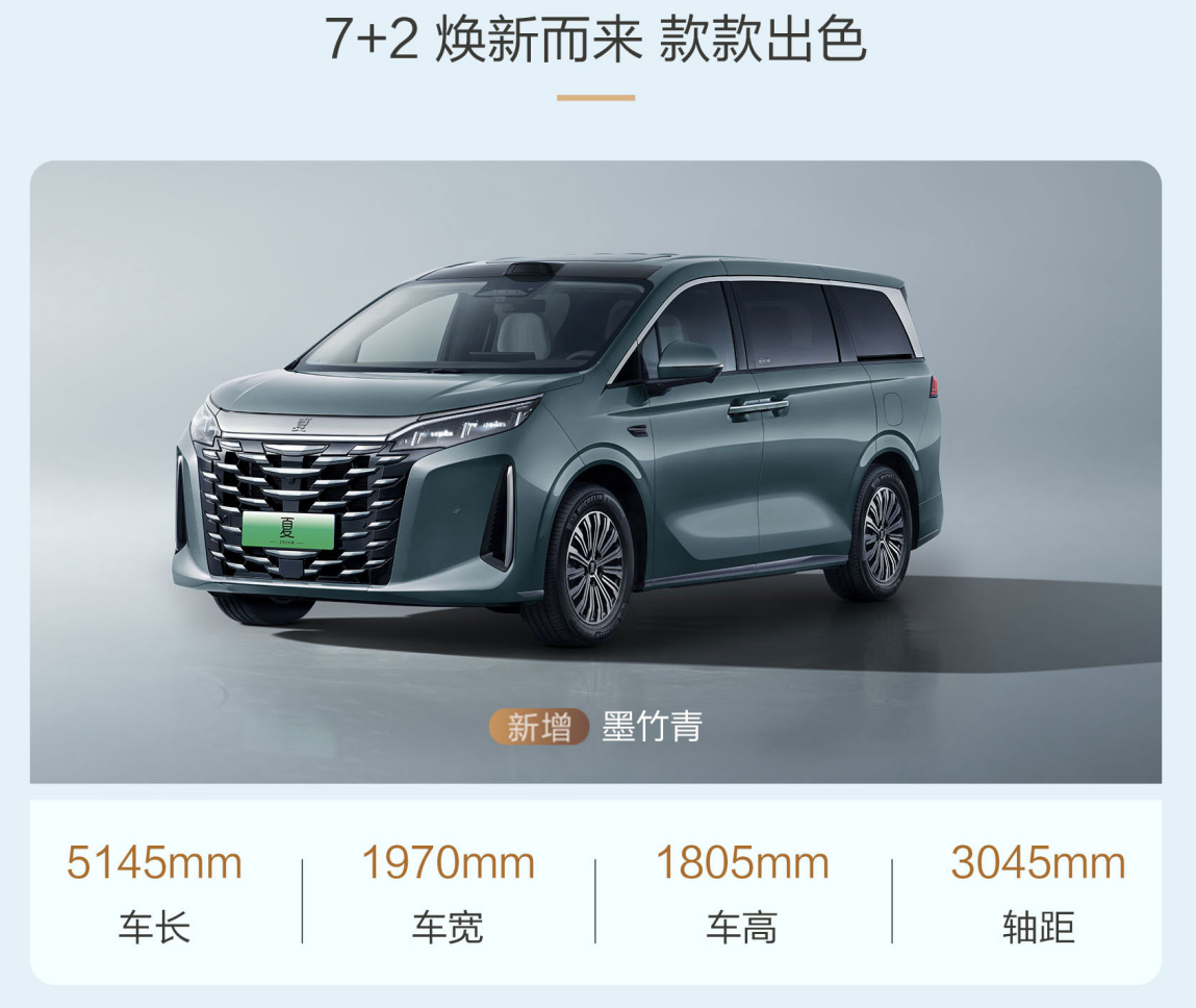 外觀設計上,2026款夏延續了“山水意境”與“龍顏美學”的設計語言。封閉式前臉、立體龍須飾條與鷹眉大燈構成極具辨識度的視覺符號,前臉中部的“龍須線”與貫穿燈帶延展至車側,使整車更顯修長大氣。新款新增“遠山青”配色,為整車增添了寧靜與內斂的東方氣韻。車身采用平直腰線與方正輪廓設計,配合電動側滑門,既適合商務場景的尊貴展示,也滿足家庭用車的便利需求。車身尺寸依舊為5145×1970×1805mm,軸距3045mm,空間表現寬裕且靈活。