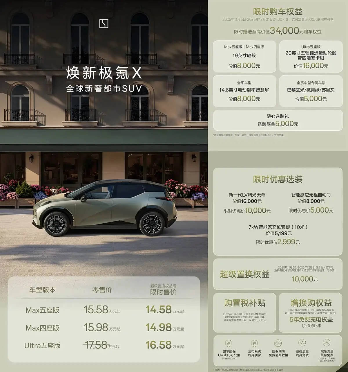 極氪品牌近日推出旗下緊湊型SUV新款極氪X,以煥新姿態登陸市場。此次共發布三款配置車型,官方指導價區間為15.58萬至17.58萬元,疊加超級置換權益后限時售價下探至14.58萬起。即日起至12月31日24時前支付5000元定金的用戶,可額外獲得價值最高3.4萬元的購車禮包,包含5000元選裝基金等專屬權益。