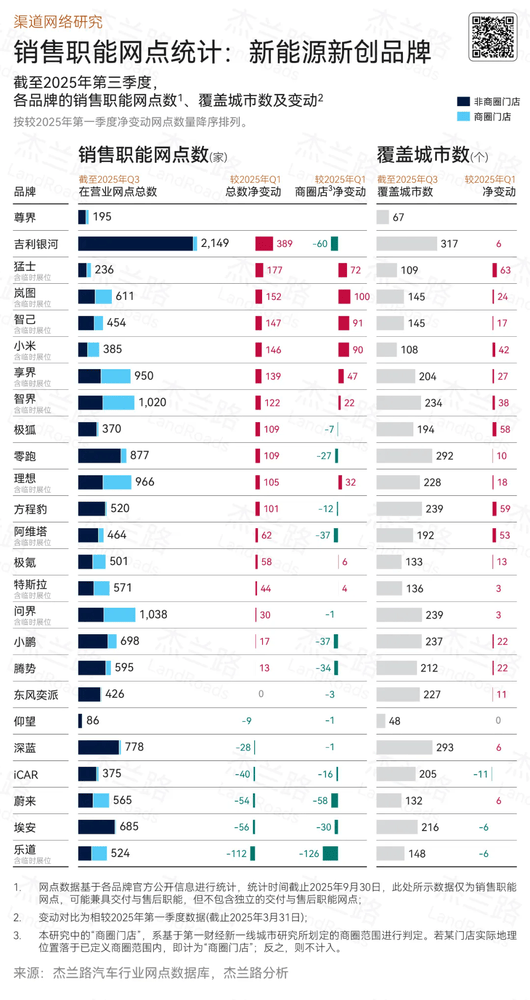 創新渠道形態成為競爭新焦點。吉利銀河打造的"吉行驛"超市型分銷網絡,三季度已突破900家,通過與商超、社區的深度綁定,將購車場景嵌入日常生活。這種模式不僅降低運營成本,更精準觸達家庭用戶群體。猛士、嵐圖等品牌則通過產品迭代驅動渠道擴張,前者新增236家網點覆蓋177個城市,后者借力新車密集上市實現152家終端增量。