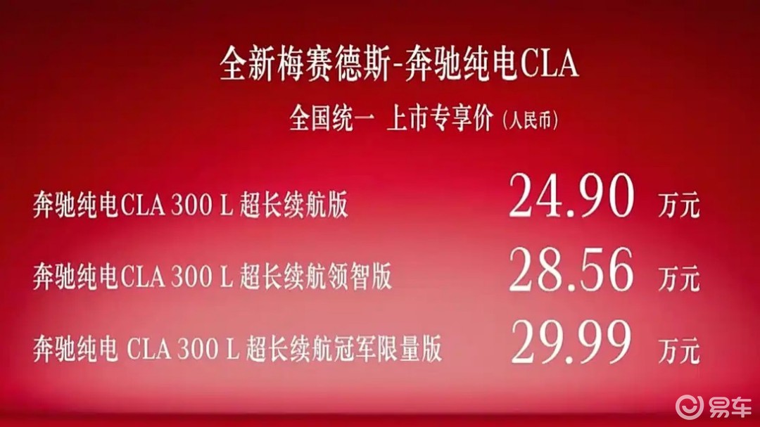梅賽德斯-奔馳全新純電CLA近日正式登陸中國(guó)市場(chǎng),推出三款配置車(chē)型,官方指導(dǎo)價(jià)區(qū)間為24.9萬(wàn)至29.99萬(wàn)元。作為基于MMA純電平臺(tái)打造的首款量產(chǎn)車(chē),新車(chē)通過(guò)866公里超長(zhǎng)續(xù)航、11安全氣囊標(biāo)配以及L2+級(jí)智能駕駛系統(tǒng),展現(xiàn)出豪華品牌在電動(dòng)化領(lǐng)域的深度布局。這款專(zhuān)為中國(guó)市場(chǎng)優(yōu)化的車(chē)型,在空間、舒適性及智能化方面進(jìn)行了多項(xiàng)本土化升級(jí)。
