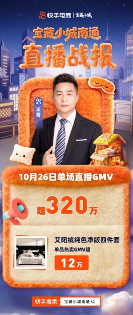 快手電商“寶藏小城”南通站活動啟動以來,立足南通家紡產業帶優勢,持續挖掘城市爆款貨品和特色文化,快速帶動城市聲量破圈和好貨暢銷。活動期間,眾多南通家紡商家和達人借勢快手電商繁榮生態、億級流量曝光及全域經營扶持,成功抓住秋冬煥新消費旺季和雙11大促節點增長機遇,實現經營躍遷與生意爆發。