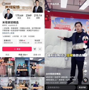 “真貨賣不過假貨的虧,我真的吃過。老百姓上過一次當,下一次一定不會再買了?!痹诩壹徯袠I沉浮20年的@米哥家紡精選,在百萬粉絲前堅持“三不原則”——不賣差貨、不追風口、不亂開發,他堅信“料子實、人實在,路就不會斷”。這種對品質的堅守,也讓米哥在快手收獲了回頭客的爆發式增長?!皩毑匦〕恰蹦贤ㄕ净顒悠陂g,米哥在10月26日推出的一場直播GMV超320萬。