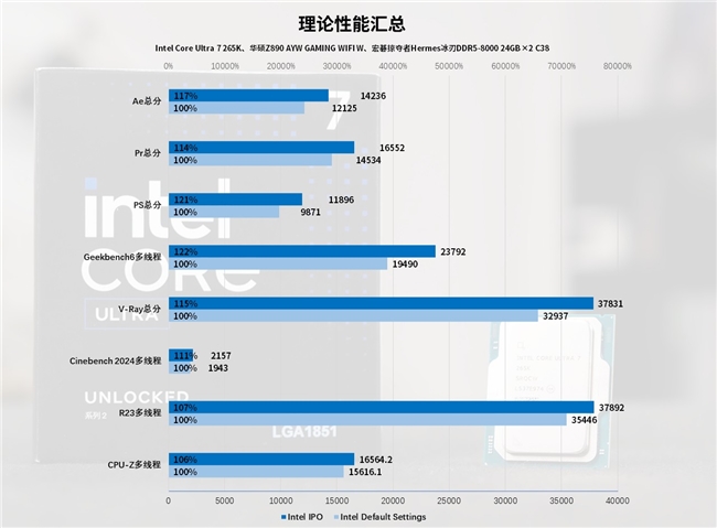 在Blender與V-Ray的渲染測試里也基本反應了類似的情況,酷睿Ultra 7 265K在開啟IPO以后,最大可以實現17%的性能提升。