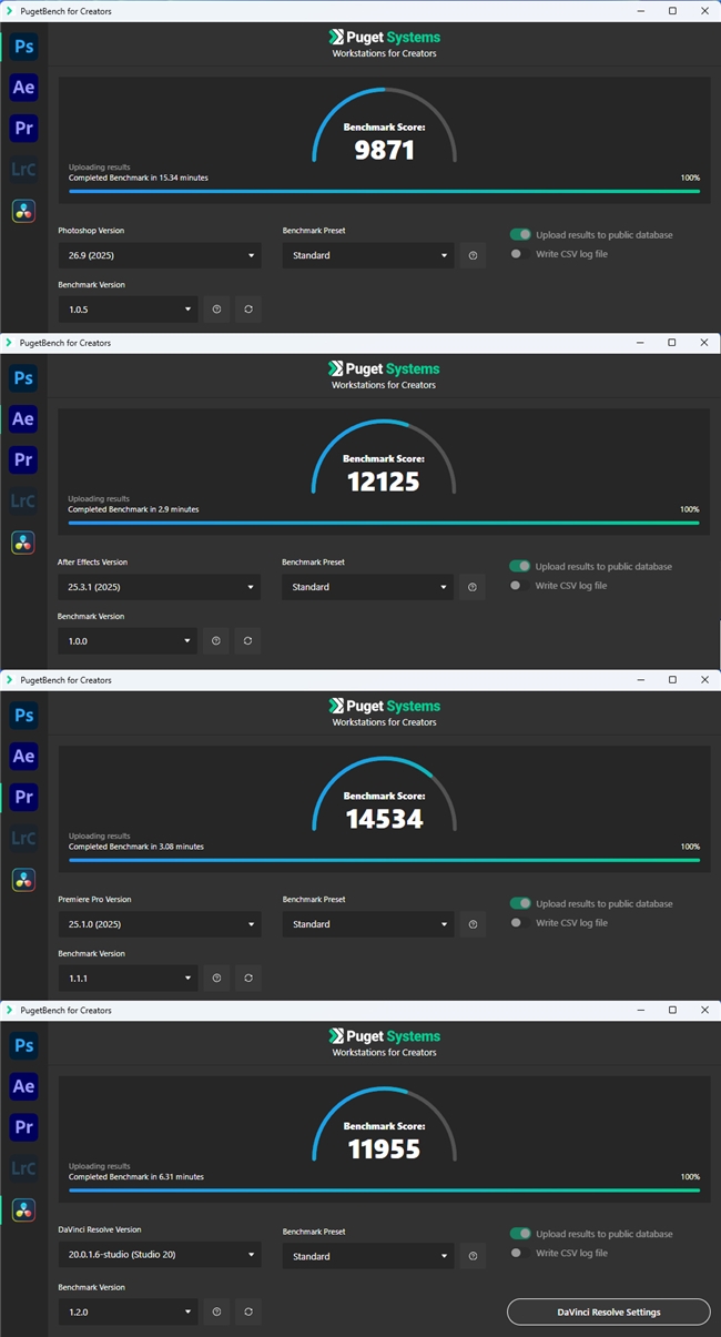 在游戲之外,Intel處理器歷來被公認為是“更優的生產力工具”,而酷睿Ultra 7 265K則將這一優勢發揮得淋漓盡致。首先我們關注一下大部分用戶關心的圖像與視頻性能,這里我們使用PugetBench模擬日常Adobe等創意軟件的使用,實測酷睿Ultra 7 265K在PS、Ae、Pr以及達芬奇中分別得分9871、12125、14534以及11955。它強大的多核性能搭配Intel獨有的核顯加速,讓你無論是拖動4K素材的時間線、添加復雜的特效,還是最終的視頻渲染導出,都能感受流暢絲滑的體驗。