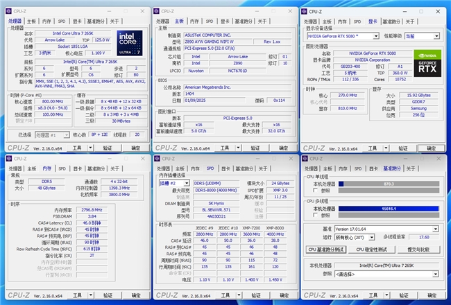 在CPU-Z測試中,全默認情況下,酷睿Ultra 7 265K的單核得分870.3,多核得分15616.1,而在啟用IPO以后,處理器的單核性能提升至887.2,提升約2%,多核則提升了6%,來到了16564.2。