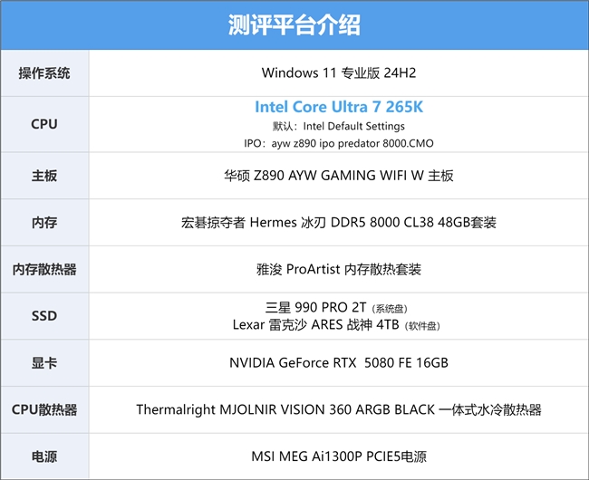 在測試開始前,我們照例介紹一下本次的測試平臺,主板我們采用的是華碩Z890 AYW GAMING WIFI W主板,作為華碩中端旗艦級主板的代表,Z890 AYW GAMING WIFI W主板不僅擁有強大的擴展性、優化的散熱設計,在超頻方面也有一定的潛力。
