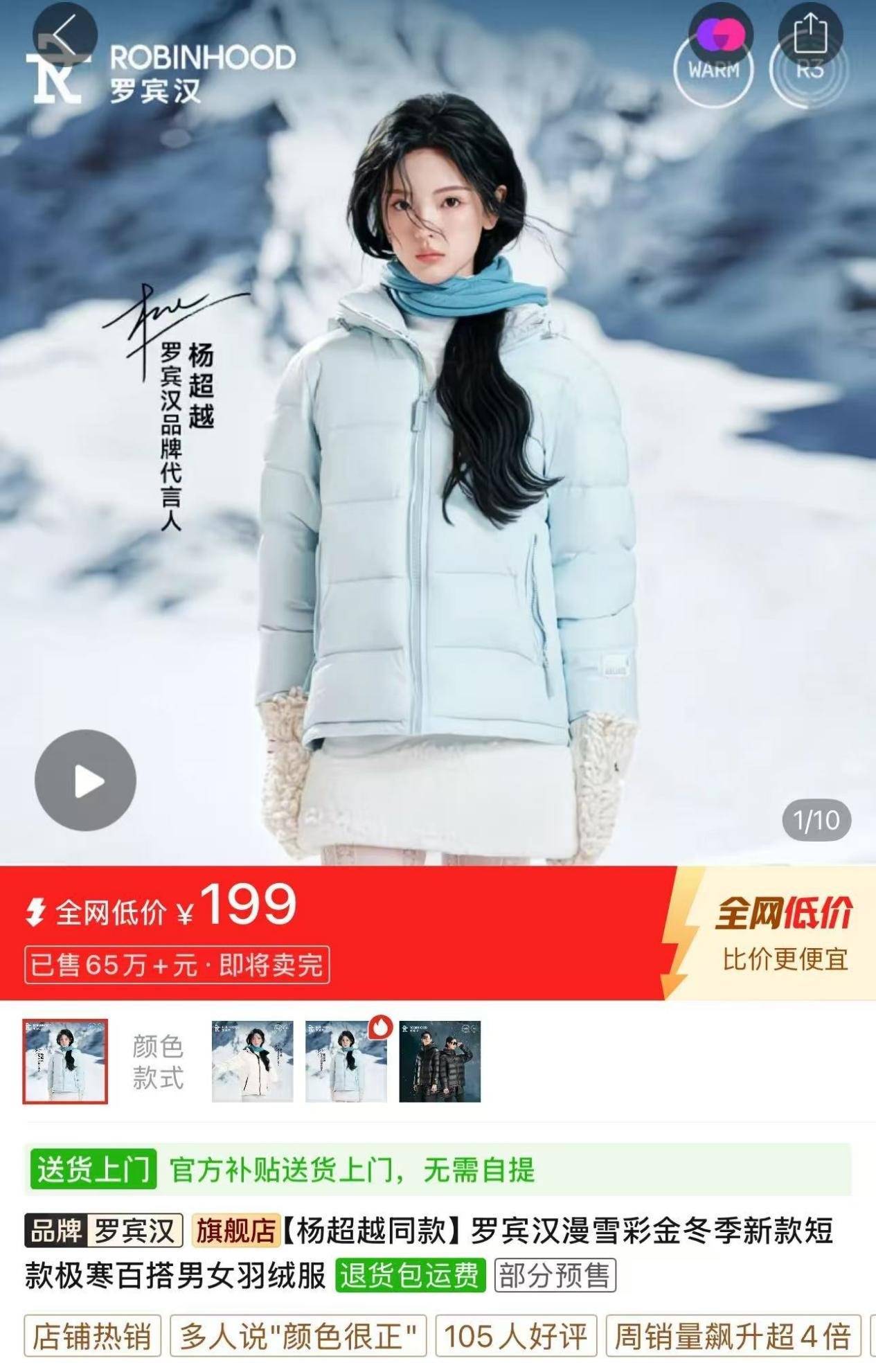 “必須做品牌,必須擁抱線(xiàn)上。”徐忠的轉(zhuǎn)型決策果斷而徹底。2022年,他斥資八千萬(wàn)元買(mǎi)斷“羅賓漢”品牌股權(quán),關(guān)閉所有虧損線(xiàn)下門(mén)店,全面轉(zhuǎn)向線(xiàn)上直營(yíng)。這一步棋很快見(jiàn)效:品牌化首年銷(xiāo)售額約3億元,2023年突破15億元,2024年更因簽約楊超越為代言人,彩色系羽絨服銷(xiāo)量激增,全年GMV達(dá)45億元。其中,拼多多渠道的表現(xiàn)尤為突出。