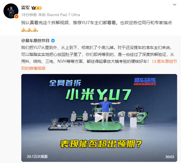 近日,易車原創節目推出了一則備受關注的視頻——“小米YU7全網首拆”,引發了廣泛討論。對此,小米科技創始人雷軍在社交平臺上作出回應,他表示自己已認真觀看該拆解視頻,并推薦YU7車主以及關注者們一同觀看,同時歡迎同行和業內專家提出寶貴意見。