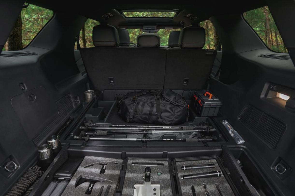 昆侖穿越版在繼承硬核基因的基礎上,針對戶外儲物需求進行優化。五座布局設計將后備箱常規容積提升至1505L,第二排放倒后可擴展至2487L,輕松容納雪板、自行車等大件裝備。新增的置物板下隱藏儲物盒拓展近100L空間,配合15個精細化儲物格與可移動擋板,實現物品分類管理。這種“魔變空間”設計,讓戶外裝備收納更高效,同時二排純平放倒后可形成1.8米舒適大床,滿足戶外休憩需求。