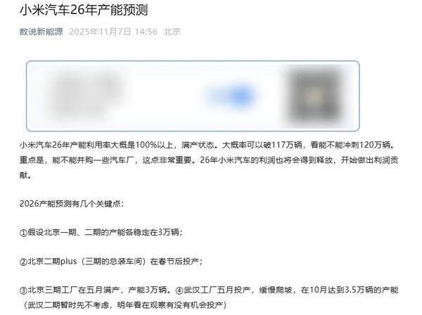 為支撐更遠期的市場目標,小米汽車正加速推進產能布局。北京二期Plus項目(三期工廠總裝車間)計劃于2026年春節后投產,武漢一期工廠則定于同年5月啟動,預計10月實現月產3.5萬輛的規模。若產能爬坡順利,疊加潛在的戰略并購,2026年全年產能有望突破117萬至120萬輛。這種“自建+并購”的雙軌策略,為產能快速釋放提供了雙重保障。