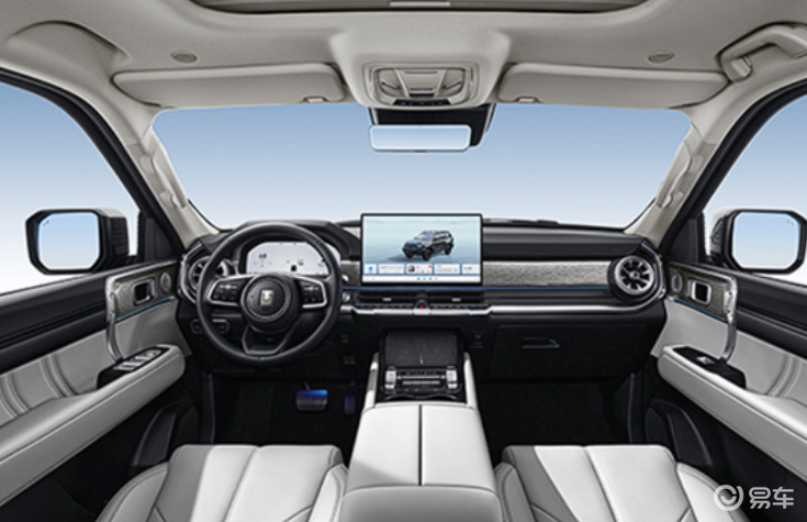 車身尺寸保持中大型越野定位,長寬高分別為4964/1970/1905mm,軸距2850mm。通過性參數方面,接近角33°、離去角31°,最小離地間隙224mm,涉水深度達800mm,具備應對城市內澇的實用能力。側面采用寬體輪眉搭配鉚釘裝飾,全新黑化輪圈進一步凸顯硬派氣質。