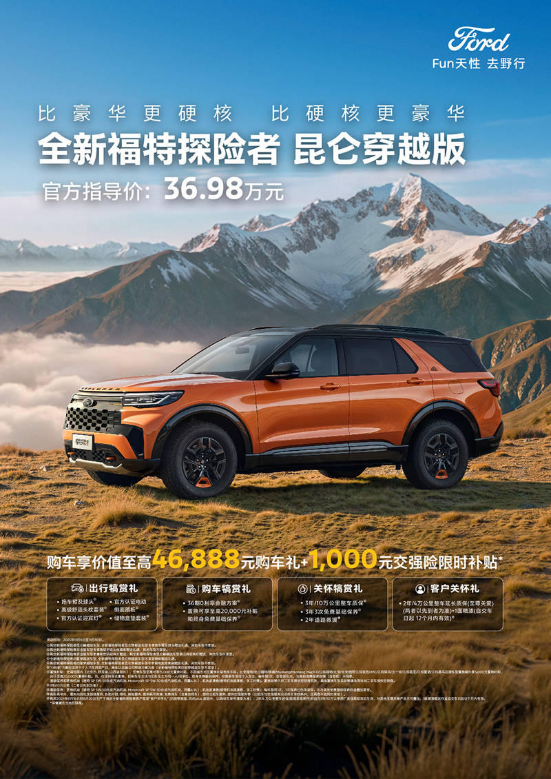 福特探險者家族再添新成員,昆侖穿越版近日正式登場,官方指導價為36.98萬元。這款新增車型以硬核越野配置為核心賣點,通過多項專屬升級強化了穿越場景的適應性,成為探險者系列中更具專業性的選擇。