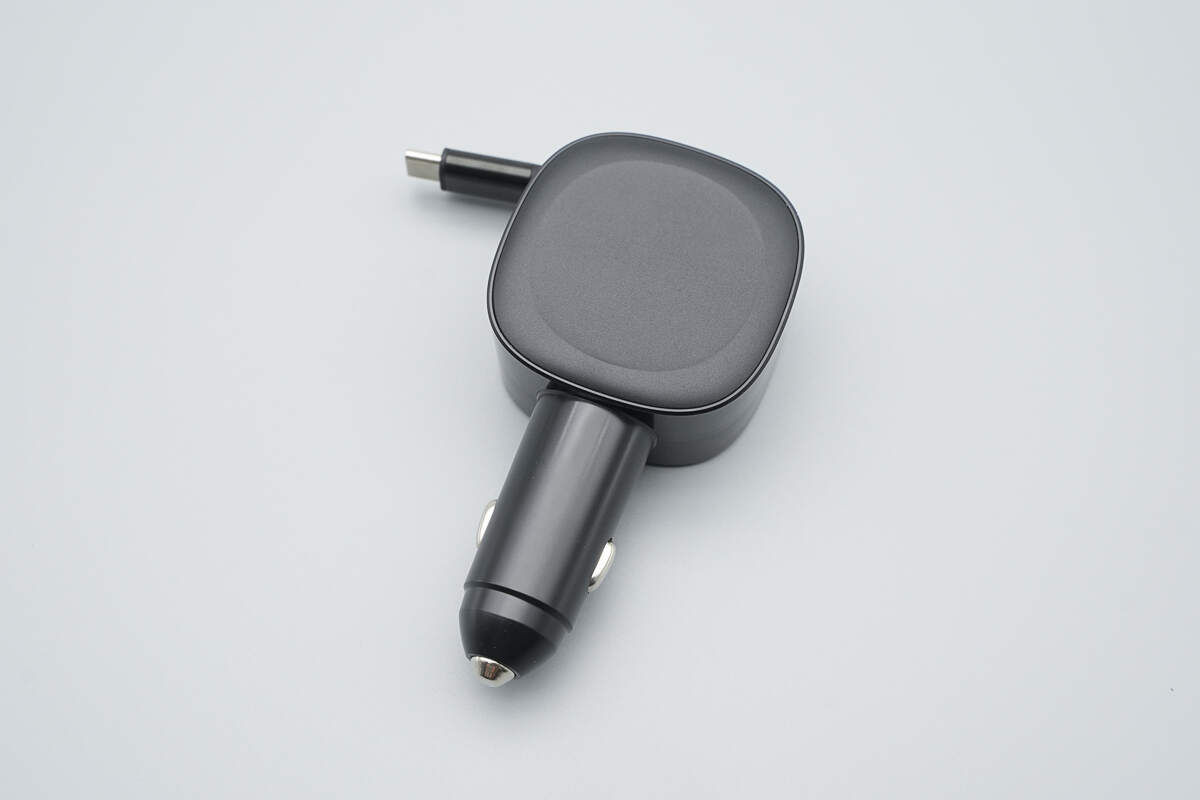 在結構設計方面,D60ACC采用"方中帶圓"的一體化造型,機身尺寸為99.64mm×51.3mm×28.95mm,重量僅73.3克。深灰色上蓋搭配高光腰線設計,重心向插頭端偏移的布局有效防止車輛行駛中的松動。點煙器插頭采用金屬半球形彈簧頂針結構,配合鍍層負極彈片與錐形導角,既保證12/24V車載座中的低接觸電阻,又兼顧插拔順暢性與耐磨性。機身側面配置的1A1C接口旁設有專用線槽,USB-C端子采用升級TPE高強度線材,72厘米線長配合自動回卷設計,既避免纏繞又保持使用整潔。