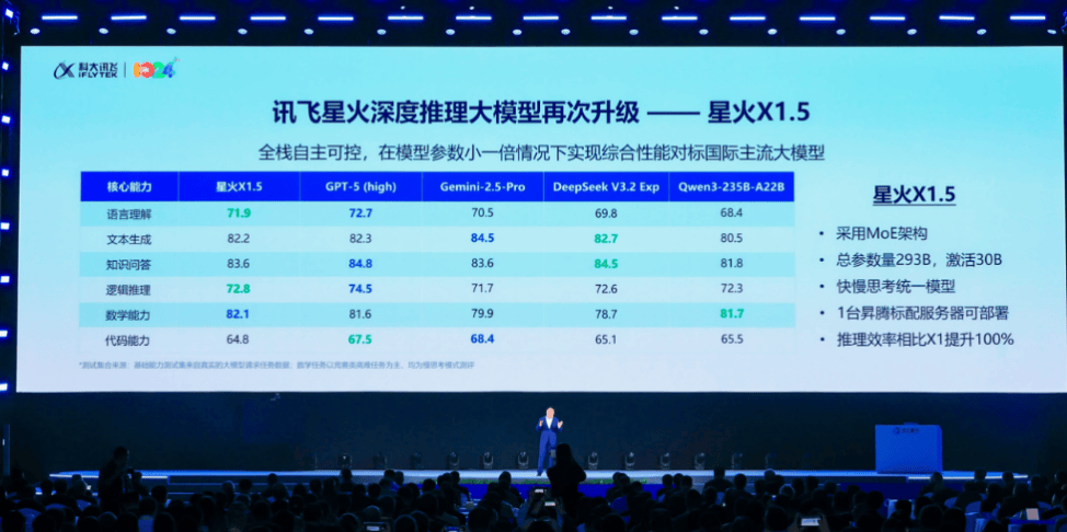 自主可控技術(shù)體系的建設(shè)被置于戰(zhàn)略首位。劉慶峰指出,中國需要構(gòu)建從算法、數(shù)據(jù)到算力的全鏈條自主能力。2025年初發(fā)布的訊飛星火X1.5大模型,采用混合專家架構(gòu)(MoE),總參數(shù)量達(dá)2930億,激活參數(shù)300億,在語言理解、數(shù)學(xué)推理等六大核心能力上全面對標(biāo)國際主流模型,其中數(shù)學(xué)能力持續(xù)領(lǐng)先,多語言支持覆蓋130個語種,整體性能達(dá)到GPT-5的95%以上。該模型在國內(nèi)首次實(shí)現(xiàn)基于全國產(chǎn)算力平臺的深度推理訓(xùn)練,訓(xùn)練效率較前代提升100%,長思維鏈強(qiáng)化學(xué)習(xí)效率從30%躍升至84%,標(biāo)志著中國在自主可控AI基礎(chǔ)設(shè)施領(lǐng)域取得關(guān)鍵突破。