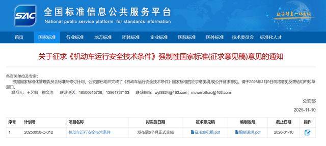 近日,國家標準信息公共服務平臺對外公布,由公安部牽頭制定的《機動車運行安全技術條件》國家標準征求意見稿已完成起草工作。該文件針對乘用車安全性能提出多項技術規范,涉及動力系統、駕駛輔助功能及電池安全等核心領域,旨在通過標準化手段提升道路交通安全水平。