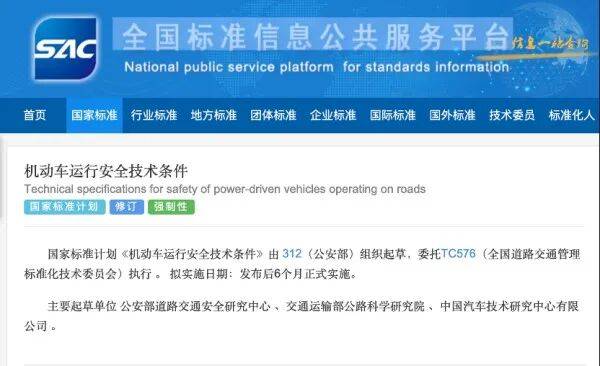 近日,全國標準信息公共服務平臺官網發布消息,由公安部牽頭起草的《機動車運行安全技術條件》國家標準計劃正式面向社會公開征求意見。該標準旨在替代現行GB 7258標準,計劃在征求意見稿發布后六個月內正式實施。參與起草的單位包括公安部道路交通安全研究中心、交通運輸部公路科學研究院以及中國汽車技術研究中心有限公司。