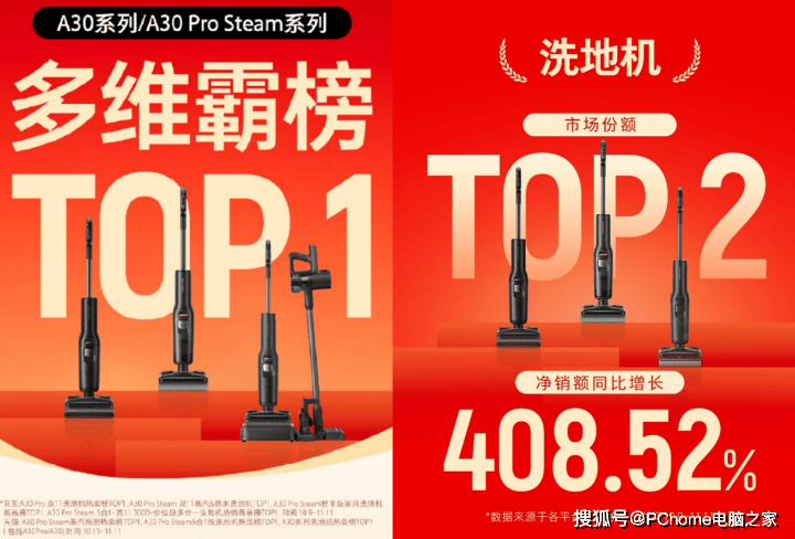 洗地機品類成為今年雙11最大黑馬。石頭科技洗地機產品線實現408.52%的凈銷售額同比增長,市場份額突破25%。其中A30系列與A30 Pro Steam系列包攬多個平臺榜單冠軍:京東平臺四款機型分獲熱賣榜、新品榜及細分價位段TOP1;天貓平臺三款機型占據熱賣榜與新品榜首位。值得關注的是,A30 Pro Steam系列憑借5合1功能設計,在3000元以上高端價位段實現銷量領跑,證明消費者對多功能集成產品的強烈需求。