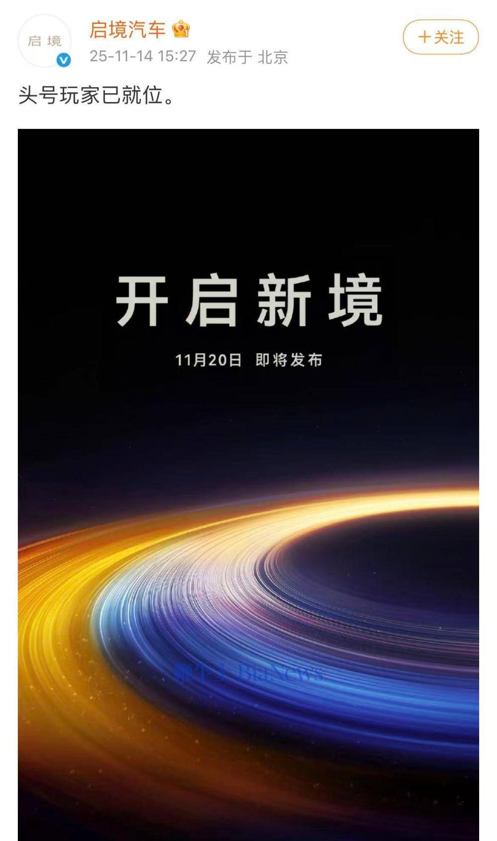 今日,啟境汽車官方微博正式上線,并發布了品牌首條動態——“頭號玩家已就位”,同步釋出一張懸念海報,引發行業關注。海報以深邃的科技藍為主色調,中央醒目位置呈現“開啟新境,11月20日,即將發布”的白色文字,傳遞出品牌即將亮相的強烈信號。