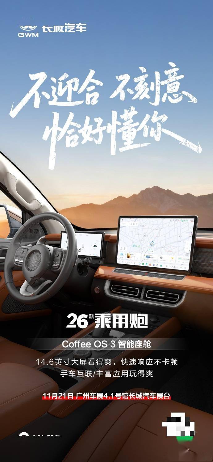 作為面向家庭用戶的乘用版車型,2026款乘用炮在智能化配置上實現重大突破。新車搭載的Coffee OS 3智能座艙系統配備14.6英寸超大觸控屏,官方宣稱其響應速度達到行業領先水平,不僅支持手機與車機無縫互聯,更內置豐富應用生態,可滿足用戶多樣化的娛樂需求。這套系統通過優化算法架構,有效解決了傳統車機卡頓問題,為用戶帶來流暢的操作體驗。