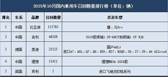 根據國家市場監督管理總局缺陷產品管理中心發布的最新數據,上月國內乘用車市場共發布7則召回公告,涉及召回車輛總數達19.64萬輛,涵蓋3個車系、5個汽車品牌。此次召回行動中,自主品牌占據主導地位,比亞迪、吉利與理想三大品牌合計召回數量超過17萬輛,占當月召回總量的近九成。