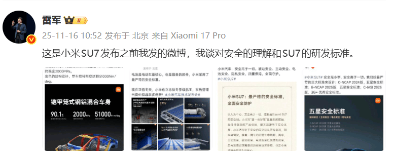 此前,雷軍曾多次公開強調“安全高于一切”的理念。此次回應進一步細化了小米汽車在安全領域的具體投入與技術突破,旨在消除公眾對新能源汽車安全的顧慮。