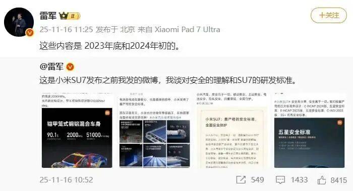 在近期與網友的互動中,雷軍針對網絡上的爭議言論作出明確回應。他指出,部分網民存在斷章取義、刻意對立的現象,將汽車產品的“外觀設計與安全性能”這兩個本應相輔相成的要素人為割裂。這一表態引發了公眾對新能源汽車安全標準的廣泛討論。