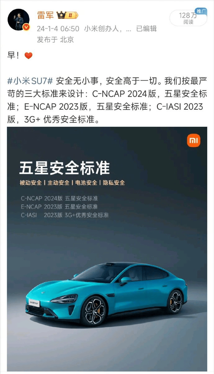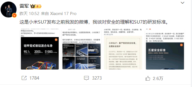 網(wǎng)友質(zhì)疑小米汽車“顏值優(yōu)先安全靠后”,雷軍連發(fā)微博力證安全至上