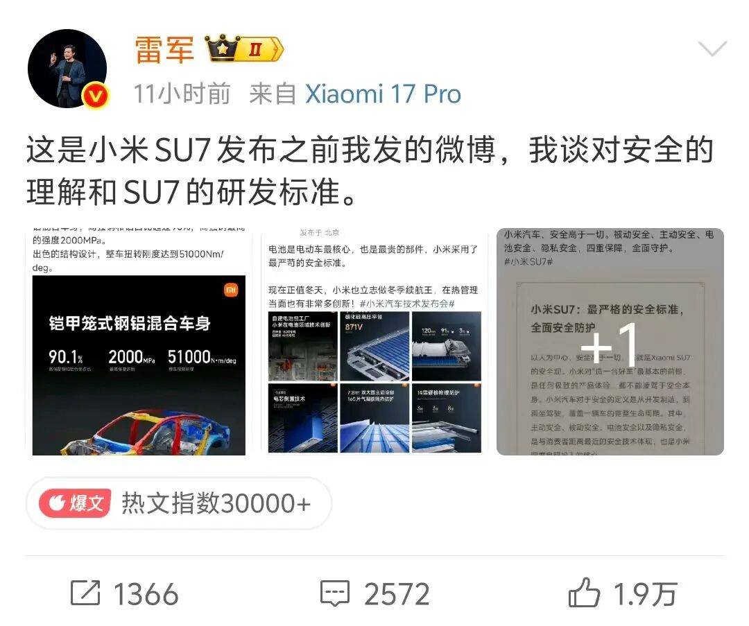 近日,小米汽車創始人雷軍在社交平臺連續發布動態,針對外界關于小米SU7“重顏值輕安全”的爭議作出正面回應,相關話題迅速登上微博熱搜榜。