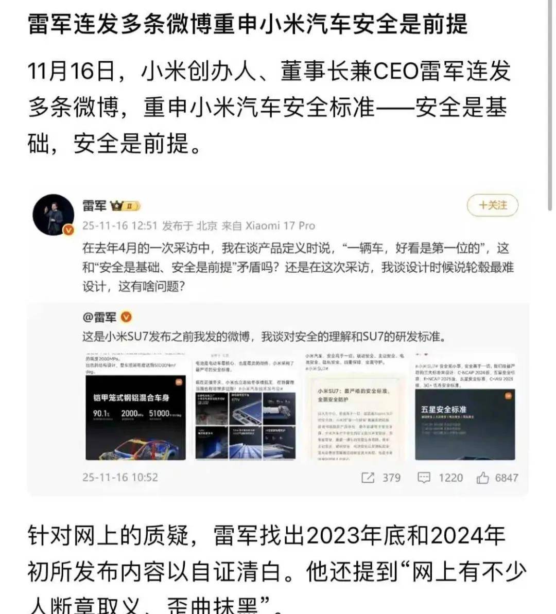 事情的起因源于雷軍此前關于汽車設計的一些公開言論。他曾提到“外觀第一”,并強調輪轂和車漆的研發難度較大。這些表述被部分媒體斷章取義,曲解為“小米忽視汽車安全”,引發了廣泛爭議。面對負面輿論的持續發酵,雷軍選擇在社交媒體上公開發聲,直言“網上不少人在斷章取義、歪曲抹黑”,并反問質疑者:“一輛車好看是第一位”的產品主張,與“安全是基礎、是前提”的原則真的矛盾嗎?設計話題里說輪轂最難設計,這又何錯之有?