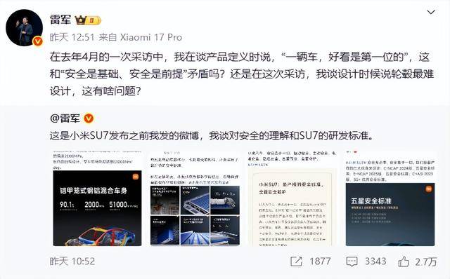 事件起因于有網友截取雷軍此前關于產品設計的言論,斷章取義地解讀為"小米汽車更注重外觀而非安全"。對此,雷軍通過微博澄清,他在2023年4月的采訪中提到的"車輛外觀是第一要素",與"安全是基礎前提"的表述并不矛盾。他進一步解釋稱,產品定義需要兼顧多重維度,但安全標準始終是研發過程中的核心準則。