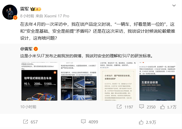 近日,小米汽車因安全話題引發(fā)輿論關(guān)注,小米集團(tuán)創(chuàng)始人雷軍通過社交媒體連續(xù)發(fā)聲,針對(duì)外界質(zhì)疑作出詳細(xì)回應(yīng)。此前,部分網(wǎng)友截取雷軍去年四月關(guān)于“一輛車,好看是第一位的”的采訪片段,將其解讀為小米汽車將外觀設(shè)計(jì)置于安全性能之上,引發(fā)爭(zhēng)議。對(duì)此,雷軍在11月16日一天內(nèi)發(fā)布三條微博,強(qiáng)調(diào)“安全是基礎(chǔ)、安全是前提”,并指出美觀與安全并非對(duì)立關(guān)系。