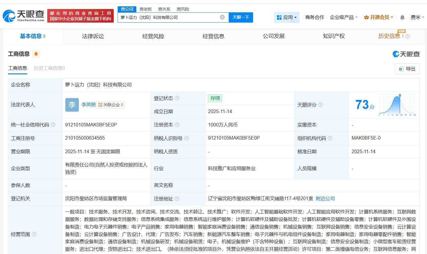 據工商信息平臺天眼查最新披露,一家名為蘿卜運力(沈陽)科技有限公司的新企業已完成注冊登記。該公司法定代表人為李英照,注冊資本達1000萬元人民幣,業務范圍覆蓋人工智能基礎與應用軟件開發、計算機系統服務等多個科技領域。