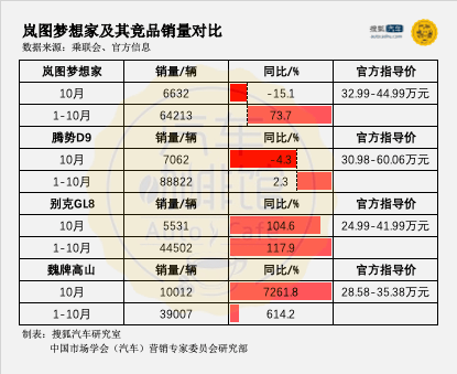 數(shù)據(jù)顯示,今年前10個(gè)月,MPV市場累計(jì)銷量達(dá)99.9萬輛,市占率回升至4.2%,同比增速高達(dá)21.5%,不僅遠(yuǎn)超整體市場增速近10個(gè)百分點(diǎn),更接近轎車與SUV市場增速的兩倍。這一轉(zhuǎn)變背后,是頭部車型的激烈角逐與市場格局的重塑。騰勢D9以8.9萬輛銷量領(lǐng)跑,魏牌高山憑借高性價(jià)比成為增速最快的車型,別克GL8在復(fù)興戰(zhàn)略下實(shí)現(xiàn)銷量翻倍增長,而嵐圖夢想家雖單月銷量同比下滑15.1%,但整體增速仍達(dá)73.7%,高于騰勢D9的-4.3%。