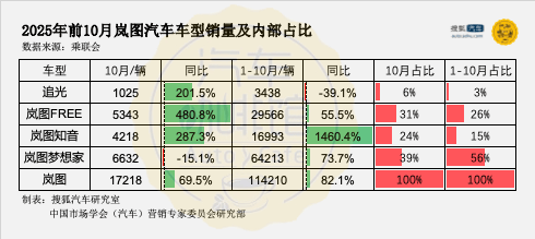 在這場競爭中,嵐圖汽車的表現(xiàn)尤為引人注目。其體系能力正從單點(diǎn)突破向全面升級轉(zhuǎn)型,多款車型協(xié)同發(fā)力成為關(guān)鍵。前10個(gè)月,嵐圖FREE與嵐圖知音均實(shí)現(xiàn)當(dāng)月及累計(jì)銷量大幅增長,其中嵐圖FREE單月銷量增長近5倍,嵐圖知音增長近3倍。三款車型在MPV、SUV、轎車市場的銷量占比分別為39%、31%、24%,形成均衡布局,助力品牌在多個(gè)細(xì)分領(lǐng)域占據(jù)頭部位置。
