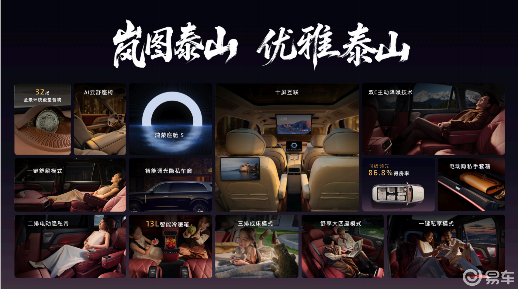 豪華體驗維度,嵐圖泰山以“中式美學”為設計語言,打造出獨具東方韻味的座艙空間。二排“AI云舒座椅”支持零重力模式與26點按摩功能,可通過橫向滑動切換“大四座模式”;第三排配備電動調(diào)節(jié)、通風加熱及獨立空調(diào)出風口,配合1.3米超寬車門洞設計,確保全艙乘客同等尊享體驗。細節(jié)處,13升冷暖冰箱、32揚聲器天籟音響系統(tǒng),以及玄墨金、鎏金紫等雙拼色車身與山水紋內(nèi)飾工藝,共同營造出移動的藝術空間。