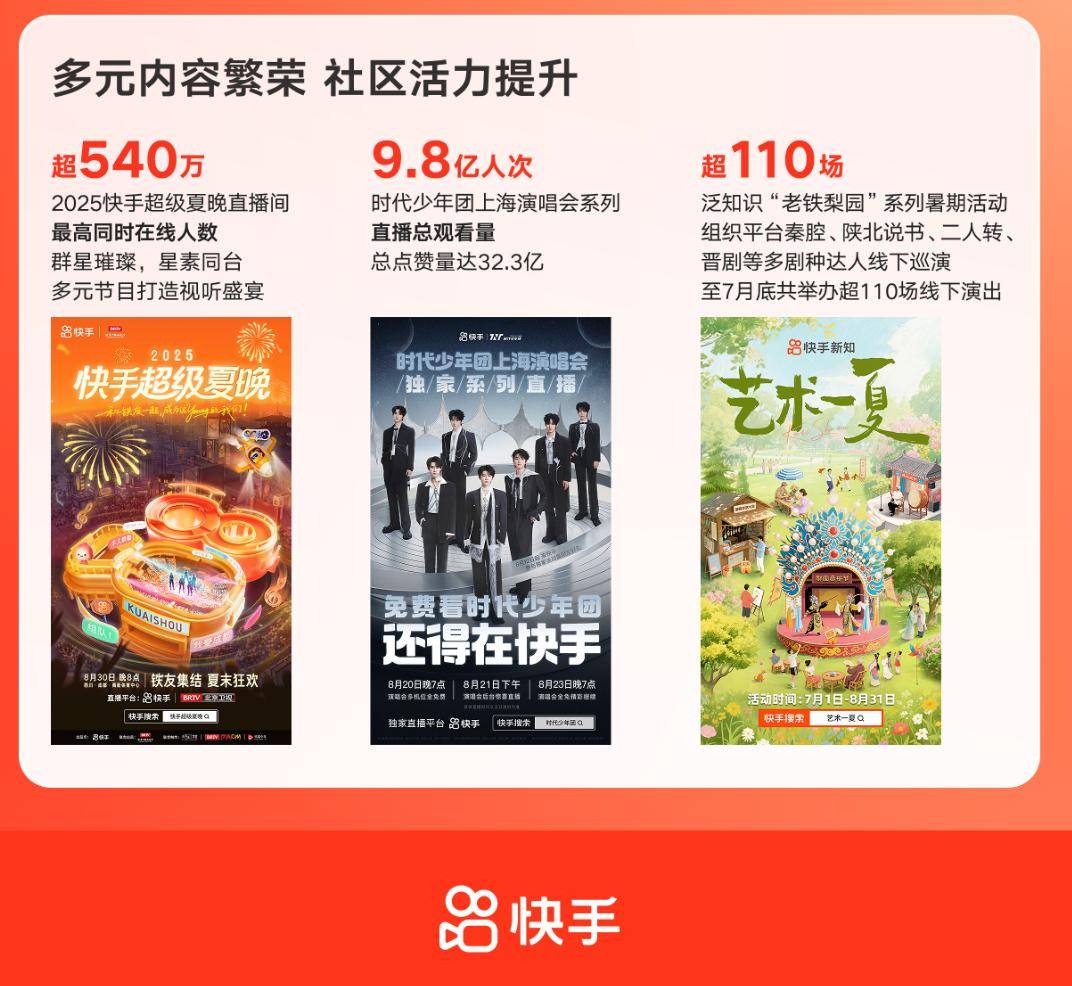內容生態與直播業務呈現多元化發展態勢。平臺聯合北京衛視打造的"超級夏晚"直播間峰值在線人數超540萬,時代少年團演唱會直播觀看量達9.8億次。傳統文化內容通過"老鐵梨園"活動實現破圈傳播,秦腔等非遺劇種獲得年輕用戶關注。直播業務收入96億元,公會生態持續擴張,簽約機構數量同比增長17%,主播數量增長20%。AI驅動的互動創新方面,"AI萬象"禮物定制功能上線首日即產生超10萬次付費使用,超級大舞臺等運營活動提升用戶參與度。