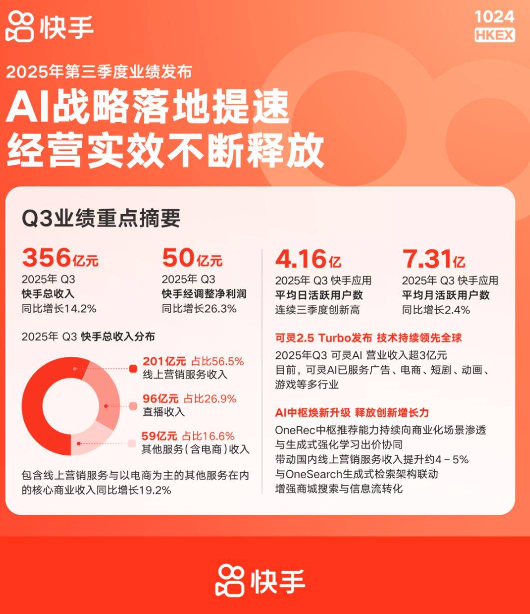 快手科技(股票代碼:“1024”)公布2025年第三季度財務報告,顯示公司營收規模與盈利能力同步提升。本季度實現營收356億元,同比增長14.2%;經營利潤達53億元,同比增幅69.9%;經調整凈利潤50億元,凈利率提升至14%。用戶數據方面,平臺平均日活躍用戶達4.16億,月活躍用戶突破7.31億,雙關用戶日均私信滲透率同比提升超3個百分點,用戶粘性持續增強。