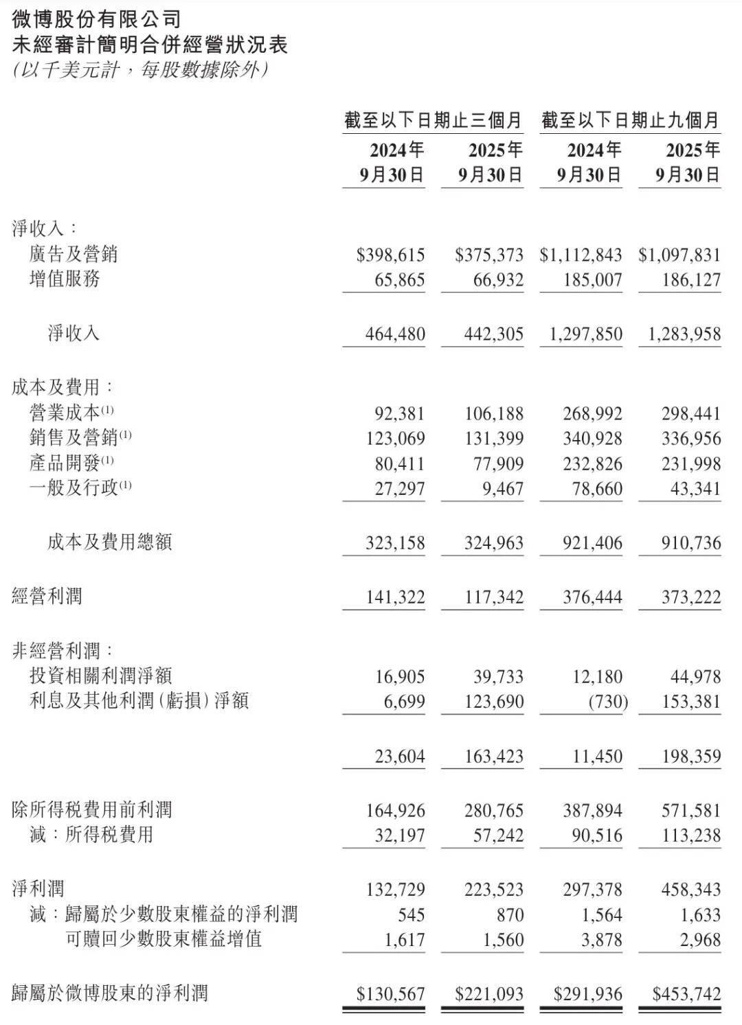 社交媒體平臺微博(納斯達克:WB;港交所:9898)近日發布2025年第三季度財務報告,顯示公司當季實現營收4.423億美元(約合人民幣31.56億元),同比微降4.9%。盡管核心廣告業務受行業波動影響,但通過優化成本結構與提升運營效率,公司凈利潤實現顯著增長,第三季度歸屬于股東的凈利潤達2.21億美元,同比增幅達68%。